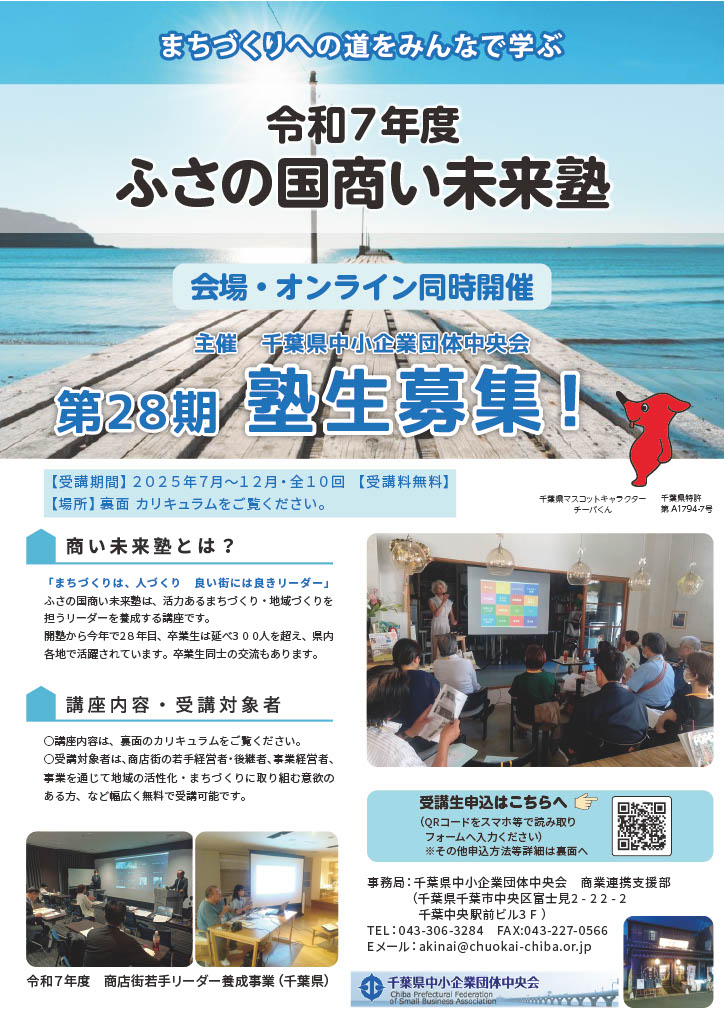 2025年12月 3日、千葉県中小企業団体中央会 主催「ふさの国商い未来塾(第28期)」にて、27期OGとして登壇しました。本講座は、地域での商いや事業づくりをテーマに、実践的な学びを行う連続講座です。今回は第28期の最終回として、総括・ミニプレゼン・パネルディスカッションが行われました。